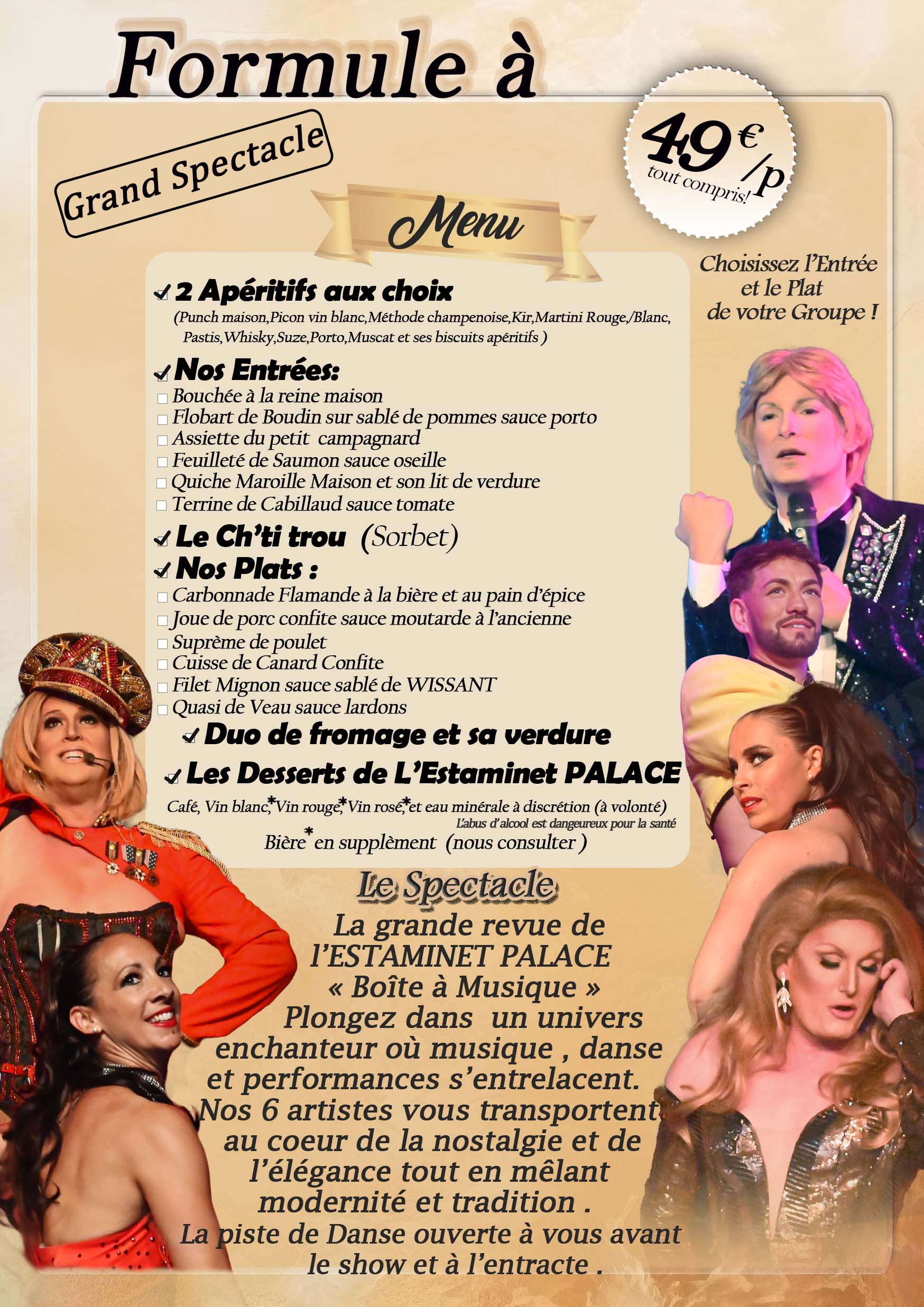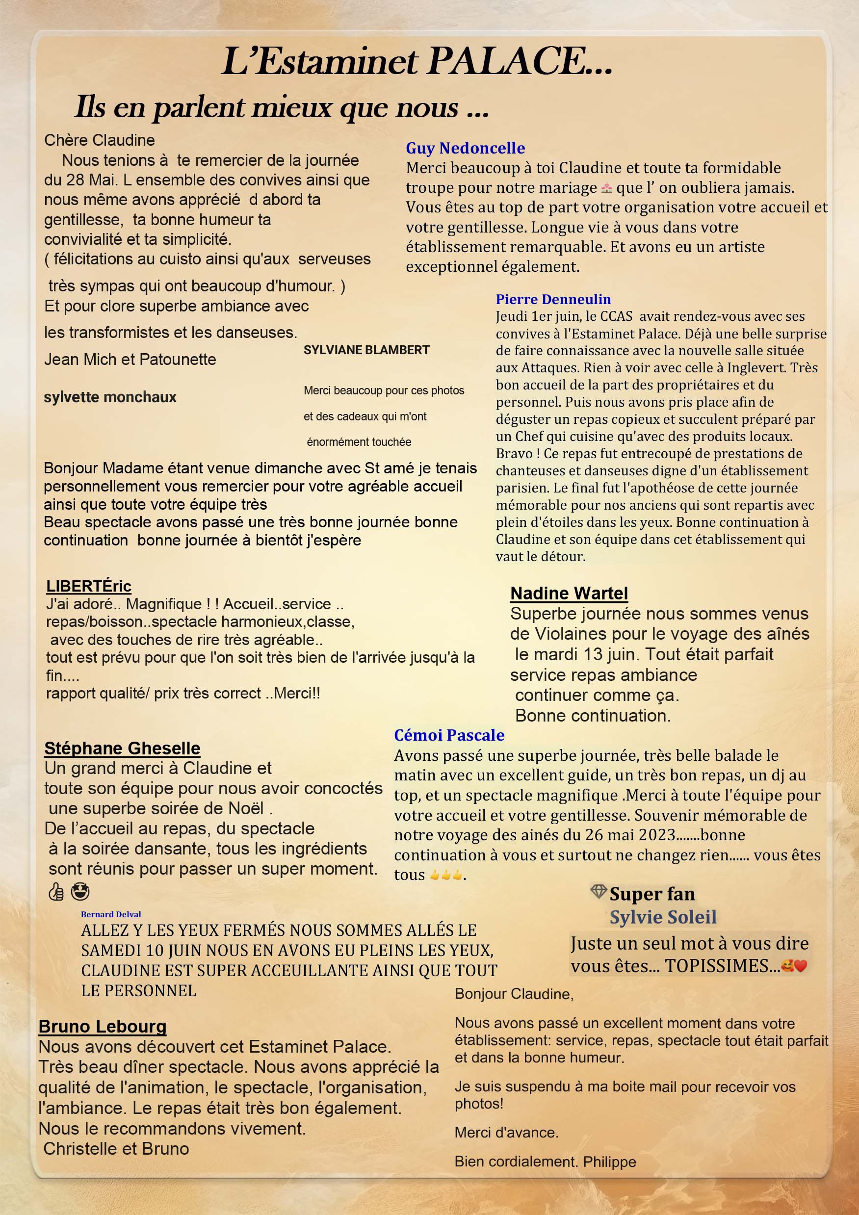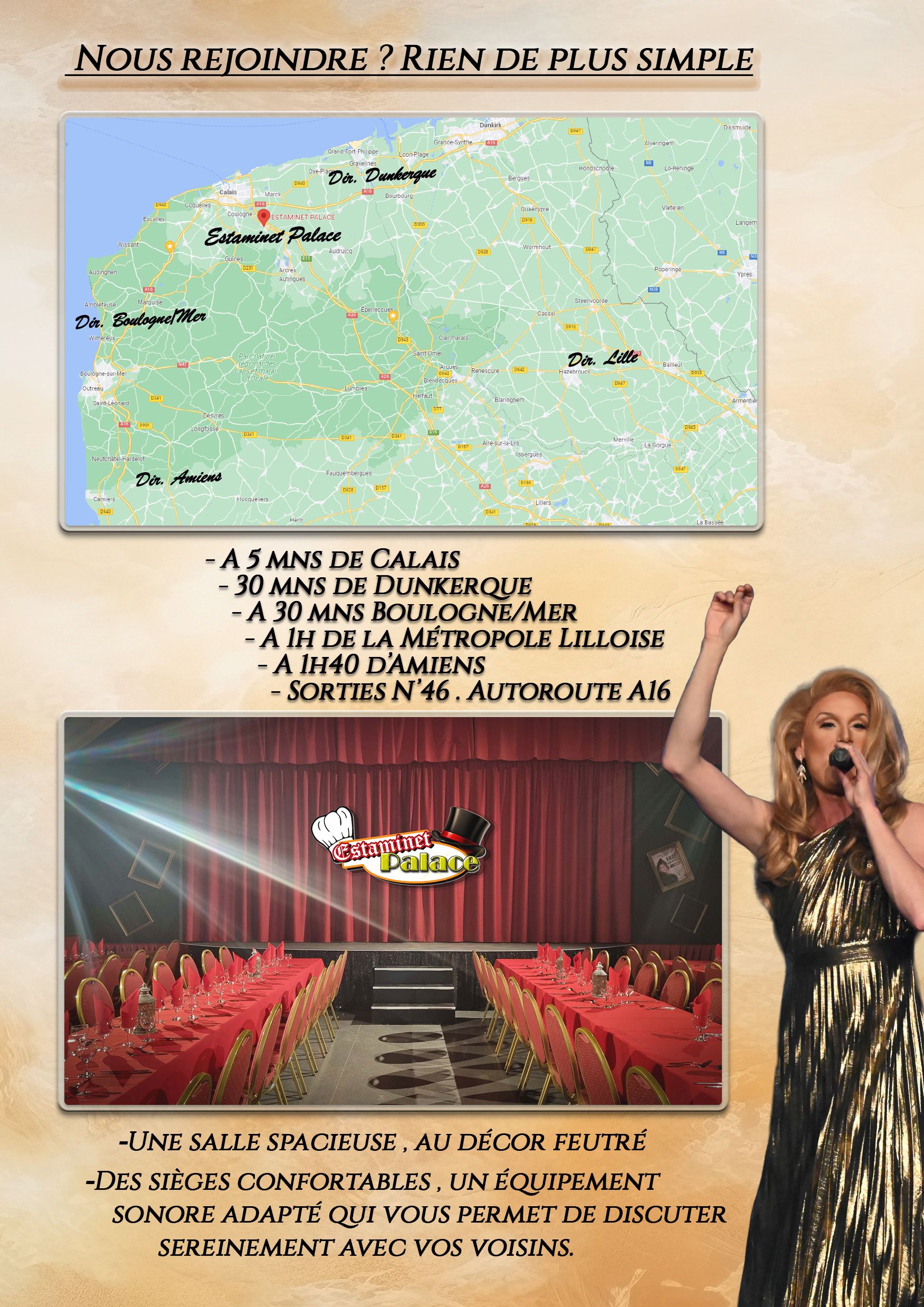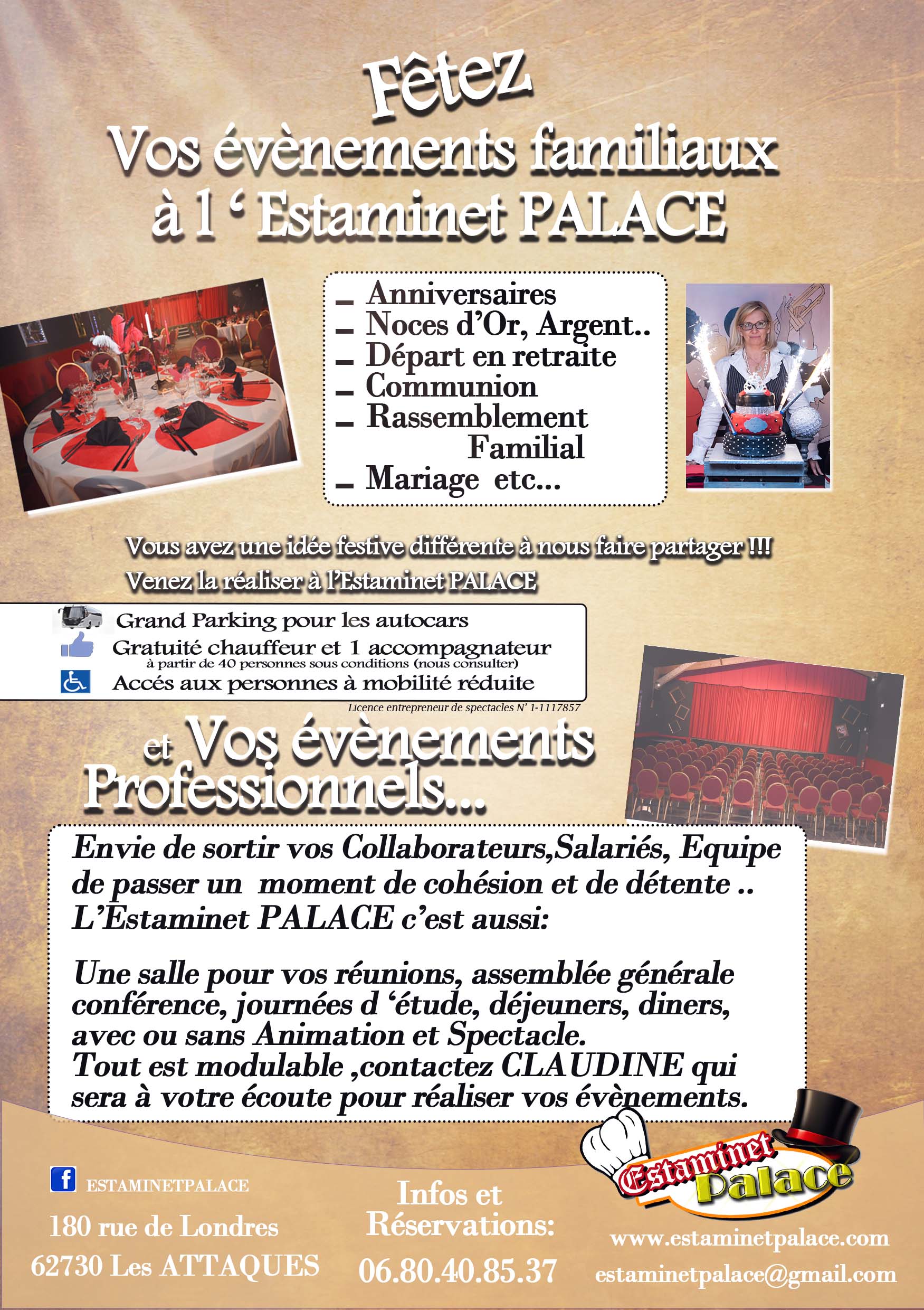 L'Estaminet Palace accueille depuis plus de 10 ans les groupes d’associations ou clubs mais aussi les particuliers pour leurs offrir des déjeuners spectacles d’exceptions avec un rapport qualité prix inégalable dans la région.