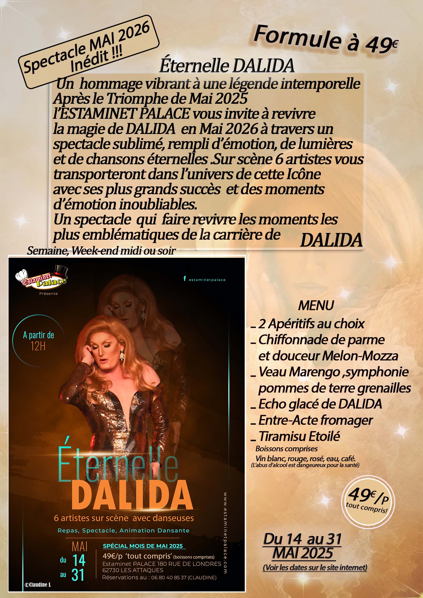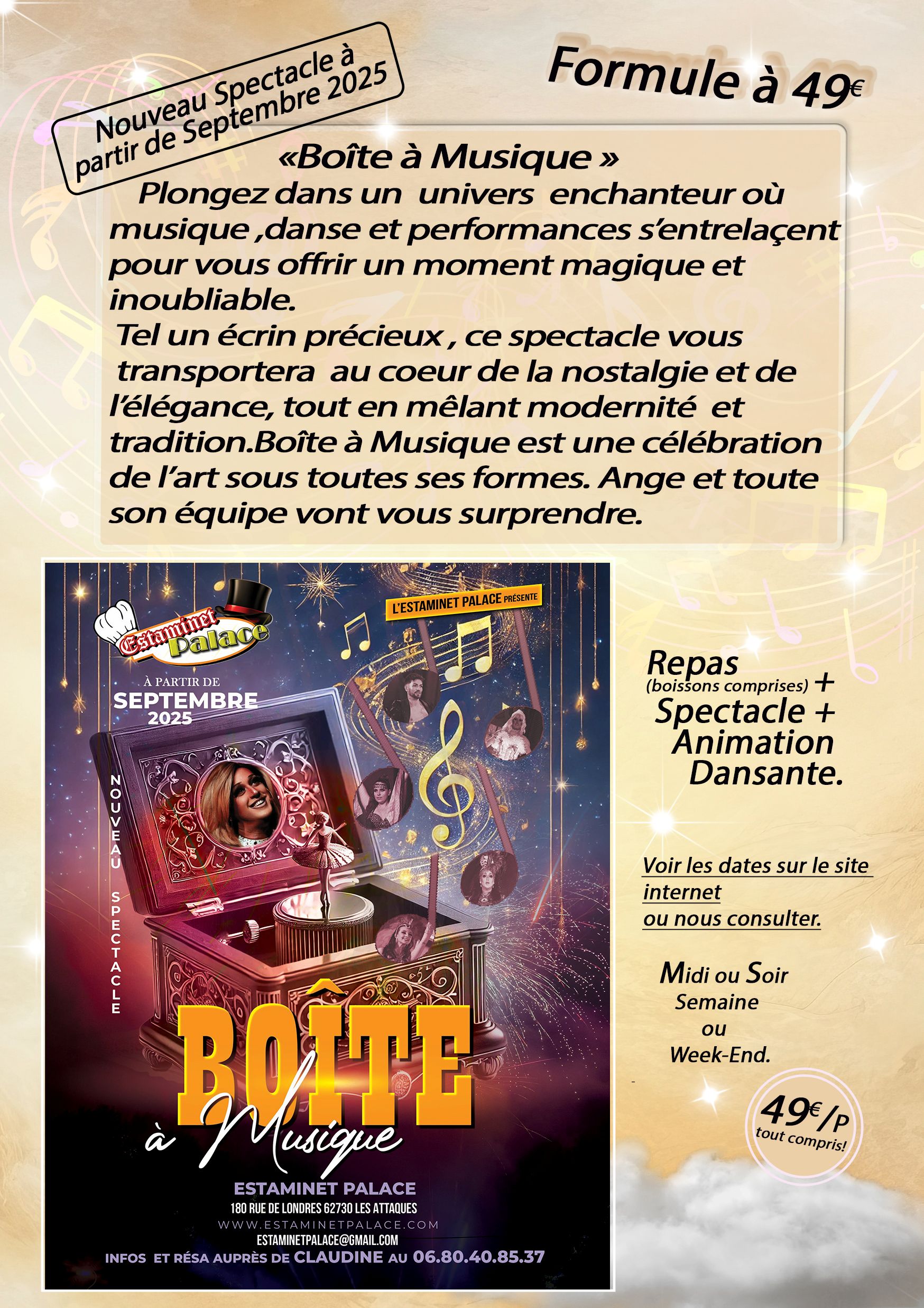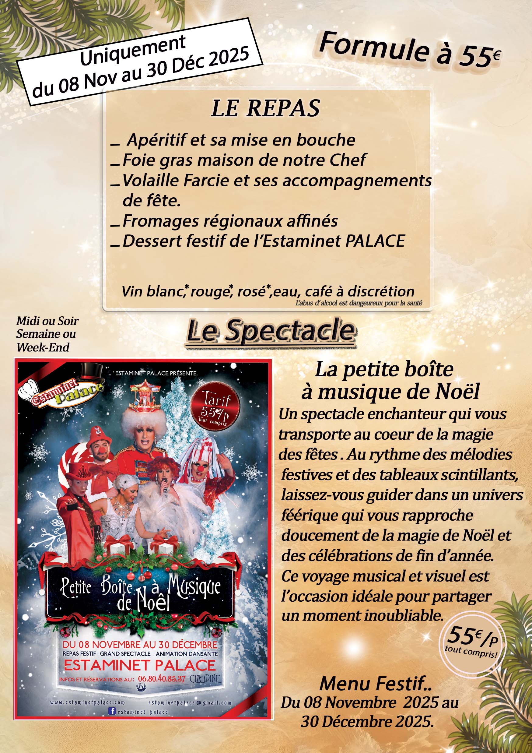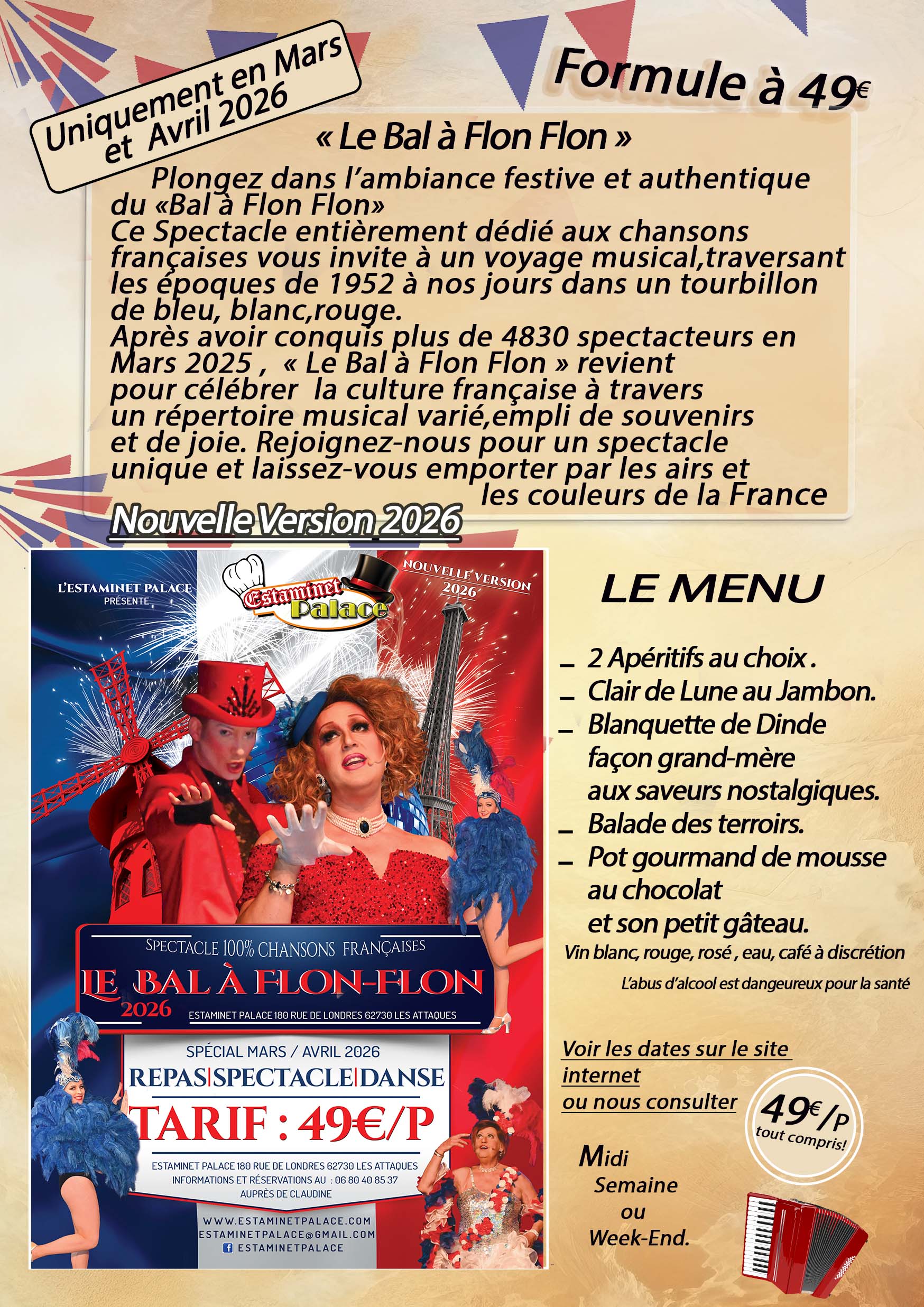 L'Estaminet Palace accueille depuis plus de 10 ans les groupes d’associations ou clubs mais aussi les particuliers pour leurs offrir des déjeuners spectacles d’exceptions avec un rapport qualité prix inégalable dans la région.
